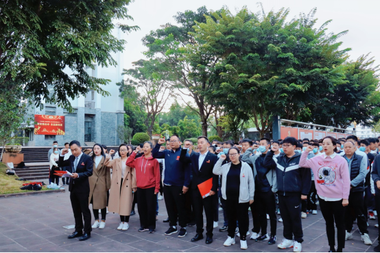 7点10分,升旗仪式开始,大家精神饱满,在团结广场上整齐列队。随着一声“升国旗、奏国歌”的口令,英姿飒爽的国旗护卫队队员昂首挺胸,迈着铿锵有力的步伐,护卫着五星红旗走向升旗台。雄壮的《义勇军进行曲》奏响,全场肃立,庄严注视着鲜艳的五星红旗冉冉升起、高高飘扬,并高唱国歌,传递对祖国的崇高敬意。在支部书记刘松同志领誓下,大家面向中国共产党党旗,郑重举起右拳,重温誓词,回忆初心,用发自内心的声音抒发奋斗新征程、永远跟党走的决心,慷慨激昂的宣誓声在广场上空久久回荡。